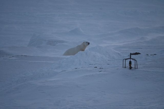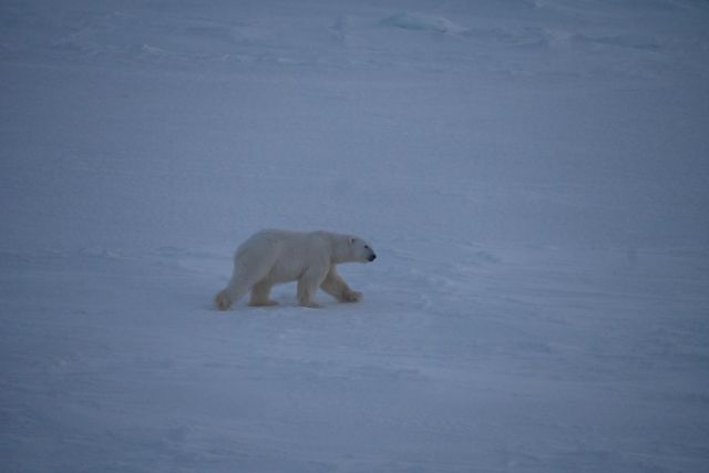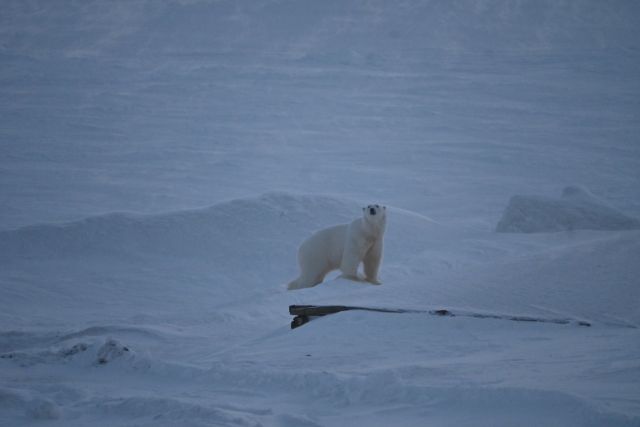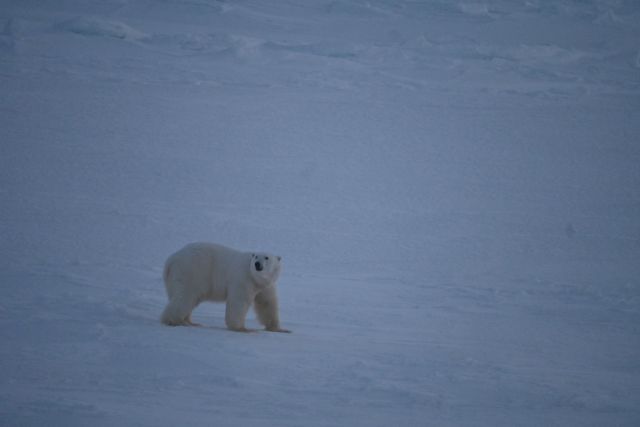 Isbjørnene tar ikke helgefri. De vandrer omkring på leting etter mat. I ettermiddag jobbet vi en del ute og var som vanlig på utkikk etter isbjørn. Ingen isbjørn var å se til vi fikk gjort ferdig jobbingen. En liten stund etter at vi kom inn, kom det en forholdsvis liten isbjørn ruslende på isen rett utenfor stasjonen. Den tok en liten snusetur bortom helipaden, forsvant ned på isen igjen men en times tid etterpå gikk den opp på Antennesletta i mørket og forsvant.