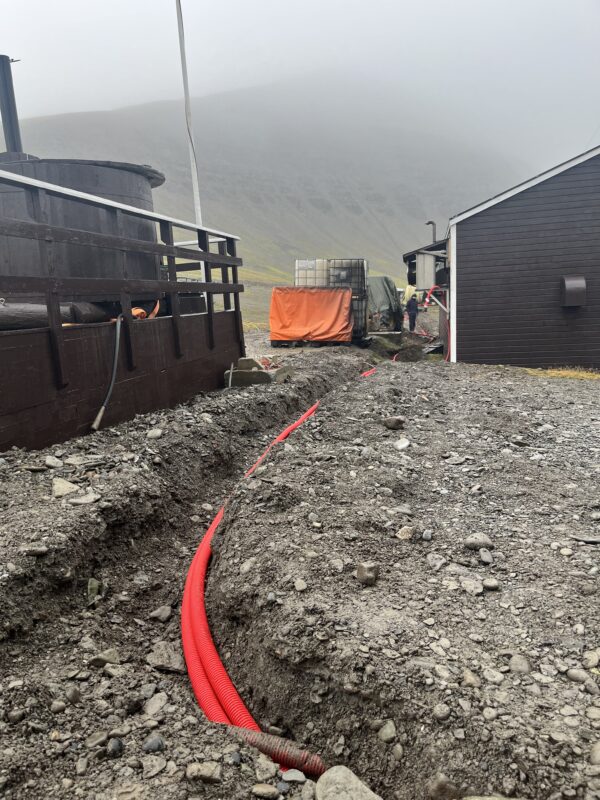 Vi graver grøfter og legger trekkrør. Det skal legges ned ein brannsignalkabel for å knytte resten av bygga på brannsentralen vi har i hovedhuset.Grønt og fint på finvêrsdagane på hausten.