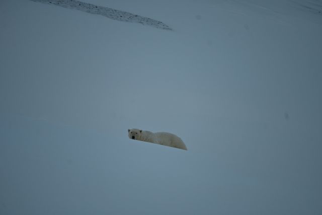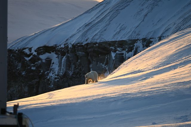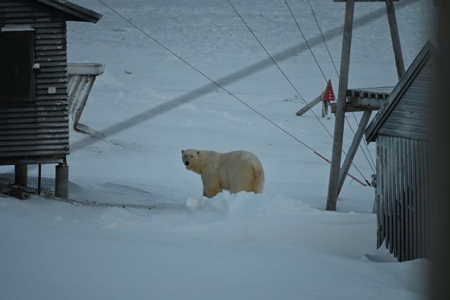 Isen har kommet og godt en del utover i januar men nå i februar har den stabilisert seg noe og temperaturen hadde sunket ned til rundt 15 minusgrader. Vi har lenge snakket om når kommer den første isbjørnen. Ved ettiden i dag dukket den opp. Da kom en ung hannbjørn ruslende sørfra ute på isen, rett ut for fuglefjellet. Den kom opp til helipaden og ble forsøkt skremt av både hunder og skudd med signalpenn. Den lot seg ikke skremme så lett så et par skudd med signalpistol, ble for ubehagelig høy lyd for den, så den løp ut på isen og ruslet vel en kilometer utover. Der la den seg ned ved en åpen råk i isen for å slappe av og kanskje jakte på sel.
