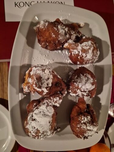 Til 3-kaffen hadde undertegnede laget nederlandske krentenbollen, på norsk; friterte rosinboller. Oliebollen og krentenbollen serveres tradisjonelt på nyttårsaften i Nederland. Sprøstekte boller som er myke og saftige inni og med et lag med melis utenpå.